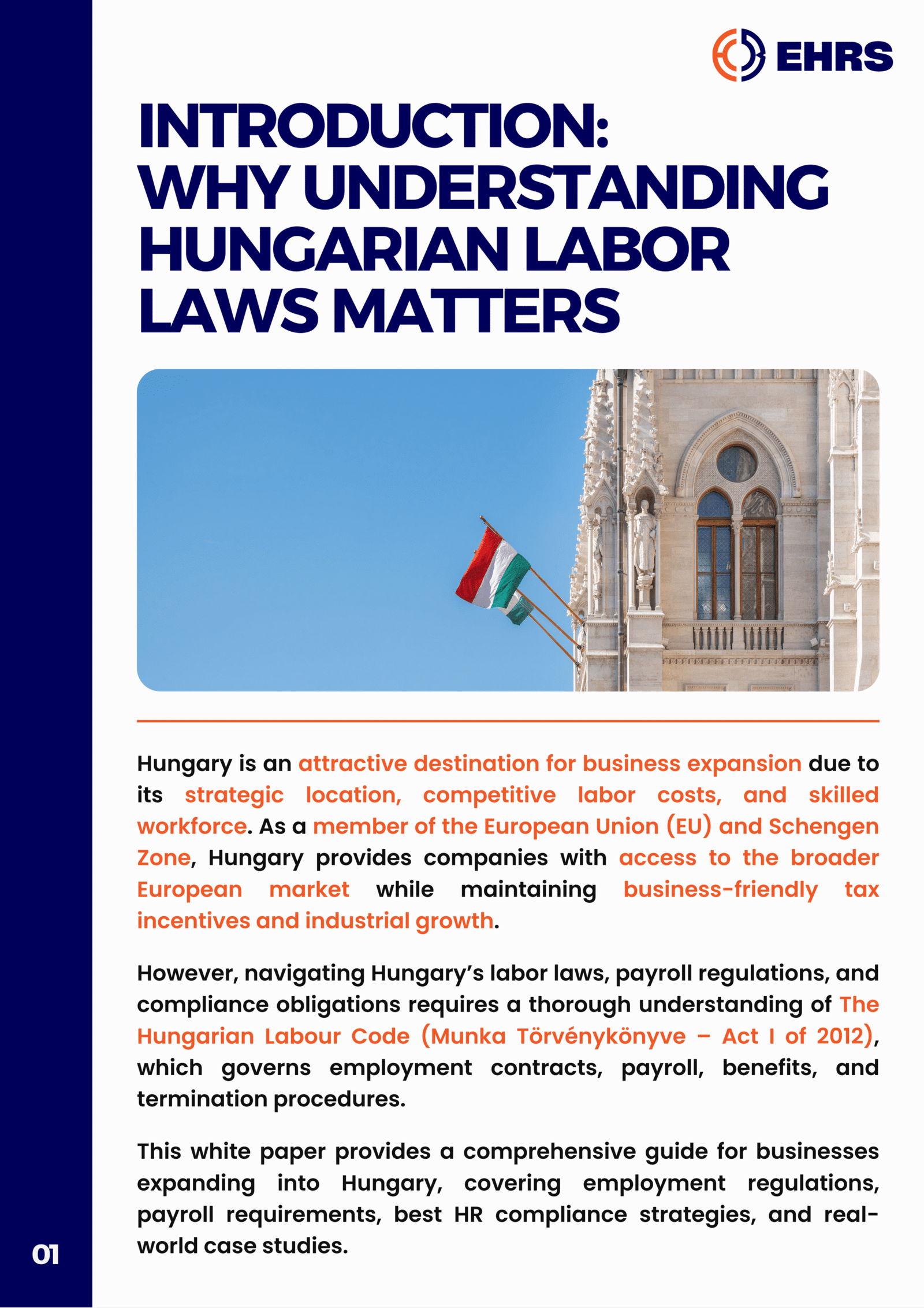 However, HR operations in Hungary can present challenges for U.S. and UK companies unfamiliar with the local labor code, language-specific documentation, and evolving regulatory expectations. Employment contracts must be in Hungarian and follow strict content guidelines. Employers must also comply with rules around probation periods, paid leave, working hours, and social security contributions. Managing these requirements internally can increase the risk of compliance gaps and administrative delays. By outsourcing HR to a local expert like EHRS, businesses can streamline market entry, ensure legal compliance, and manage payroll, contracts, and employee documentation in full alignment with Hungarian and EU labor law.